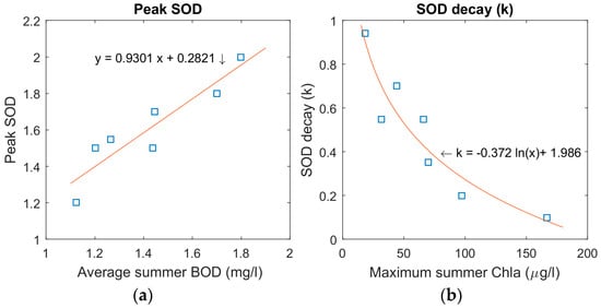 Relationships between SOD (day−1), and observed BPL measurements, after the final DO model simulation: (a) Predicted peak SOD and average open water BOD inflows (R2 = 0.85); (b) Back-calculated winter SOD decay, and observed maximum summer Chla concentrations of the previous summer (R2 = 0.88).