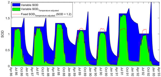 A comparison of the maximum SOD rates that we input into the model (blue) against the temperature adjusted rates that the model is actually using based on W2 default values for the four temperature-rate multipliers (green). Also shown is the temperature adjusted rates for the fixed SOD simulations.