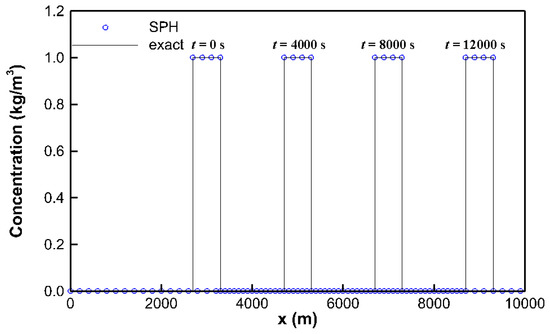 The concentration boundary conditions are given as C(0, t) = 0 kg/m3 and C(10,000, t) = 0 kg/m3, while a water depth of 0.5 m and a water velocity of 0.5 m/s are prescribed as the inflow boundary condition. The total number of fluid particles is 100 and the initial time step is 100 s. The exact solution is given from [14].