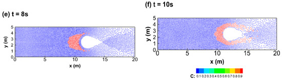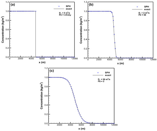 In this case, subcritical flows occur at the inflow and outflow boundaries, and the inflow water velocity of 0.5 m/s and the outflow water depth of 0.5 m are prescribed. 100 fluid particles are involved in solving SWEs and ADEs based on the initial time step = 200 s. The exact solution of this case is given in [1]. The simulated profiles of concentration with the diffusion coefficients of 0 m2/s, 2 m2/s, and 50 m2/s at t = 9600 s are respectively given in Figure 3. It can be found that the moving speed of the leading edge of Figure 3c owing to the effects of advection and diffusion is larger than the one of Figure 3a resulting from the effect of pure advection. Furthermore, the simulated results show good agreement against the exact solutions obtained in [33]. It can be concluded that the present model is capable of solving steep gradient or discontinuous solutions in concentration fields of advection-dominated, advection–diffusion, and diffusion-dominated problems. In Figure 3, the symbol Pe denotes the numerical Peclet number, which is defined as .