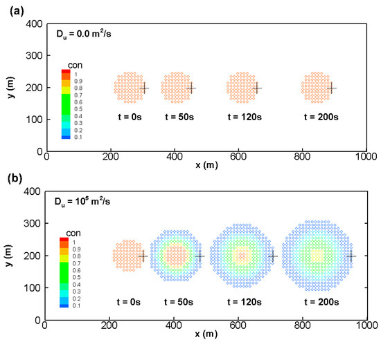 Figure 4 shows the evolutions of concentration with time. The locations of the leading edge shown as a plus sign in Figure 4a are x = 300 m, 446 m, 652 m, and 891 m at t = 0 s, 50 s, 120 s, and 200 s, respectively. It can be seen that the displacements of the leading edge are approximately 50 s × uin, 120 s × uin, and 200 s × uin at t = 50 s, 120 s, and 200 s, respectively, because of the absence of the material diffusion. Next, Figure 4b gives the locations of the leading edge are x = 300 m, 476 m, 702 m and 945 m at t = 0 s, 50 s, 120 s, and 200 s, respectively. Since the transport behavior of the tracer is subject to the coupled advection and diffusion reaction, the displacements of the leading edge in Figure 4b are significantly larger than those in Figure 4a. Furthermore, Figure 4 also demonstrates that the present model still has the ability to preserve the shape of the tracer in 2D cases.