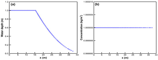The simulated profiles for the case of a dry-bed dambreak flow in the fifth study case: (a) water depth and (b) concentration.