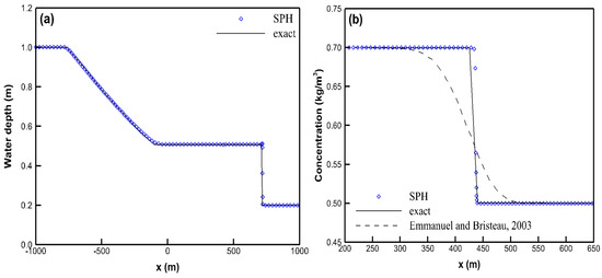 Next, a wet-bed dambreak flow is conducted in a rectangular, flat, 2000 long channel without bed friction [4]. Initially, a 1000 m long and 1 m high water with a concentration of 0.7 kg/m3 is imposed at the upstream, while a 1000 m long and 0.2 m high water with a concentration of 0.5 kg/m3 is placed at the downstream. The initial particle spacing of 1 m and the initial time step of 1 s are used herein. The exact solution is given in [4]. Figure 7 shows the simulated profiles of water depth and concentration. In Figure 7, the proposed model provides good predictions in both water depth and concentration against the exact ones. Nevertheless, the entire simulated concentration profile given in [4] is smoother than the exact one. Thus, the present model can work well under the condition existing discontinuities both in the flow and concentration filed.