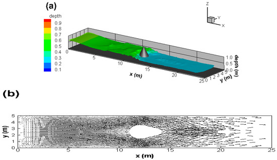 The simulated profiles for the sixth study case: (a) water depth and (b) water velocity vector.