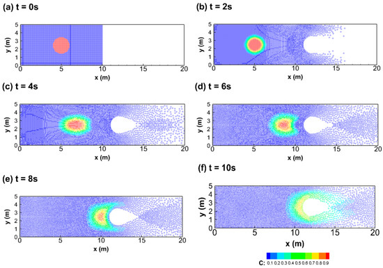 The temporal simulated profiles of concentration for the case with material diffusion in the sixth study case: (a) 0 s, (b) 2 s, (c) 4 s, (d) 6 s, (e) 8 s, and (f) 10 s.