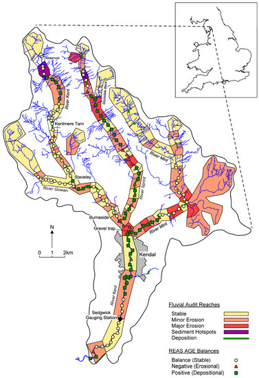 - Wallerstein, N.P. Geomorphological Assessment of the River Kent Mainstem—A Brief Assessment; Report prepared by University of Nottingham; University of Nottingham: Nottingham, UK, 2007. [Google Scholar]