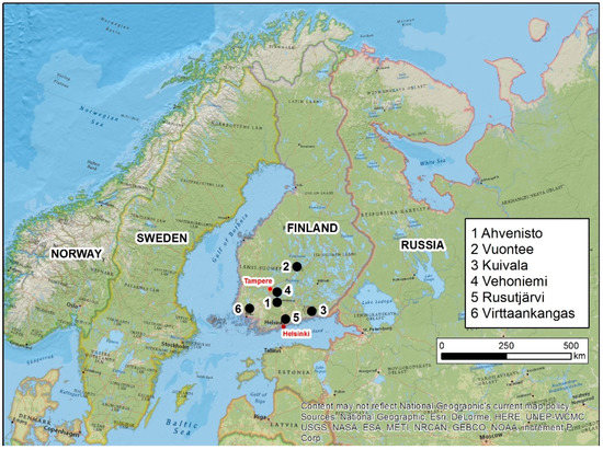 Eskers in Finland are Quaternary glaciofluvial formations which were most commonly deposited by streams that flowed in tunnels beneath the ice during the final deglaciation of the Scandinavian ice sheet. Typically, an esker consists of 20 to 50 m of gravel and sand that is covered by a thin humic soil layer (<10 cm). Eskers, which cover only 2.2% of the total area of Finland [1], are preferred areas for potable water MAR treatment. However, there are also other interests or activities connected with eskers: they can be centers of population, they are considered recreational areas or nature conservation sites, or they can be sources for extraction of gravel. When MAR plants are being planned, these interests may be contradictory. Public participation is an important feature of MAR planning in Finland [14,15]. Sprinkling infiltration and well infiltration can be attractive for areas not suitable for the construction of basins, e.g., eskers with slopes, and forest areas having recreational values with restrictions of tree cutting. When sprinkling infiltration or well infiltration is used, there is no need to dig and construct basins and the direct physical effects on the landscape are reduced. Recreational values, including minimizing the effects on landscape, are often emphasized in public participation.