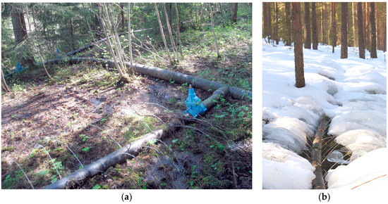 Sprinkling infiltration at (a) Ahvenisto MAR plant in May (Photographer, M. Mäkinen) and (b) Vuontee MAR plant in March (Photographer, J. Tyrväinen).
