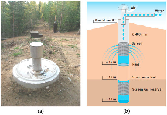 (a) An Infiltration well at Vehoniemi MAR site, with the wellhead in the forefront and influent flow metering box in the background (Photographer, M. Mäkinen); (b) The principle of well infiltration at Rusutjärvi MAR plant: infiltrated water is led to the unsaturated zone with an option to lead it directly to the saturated zone.