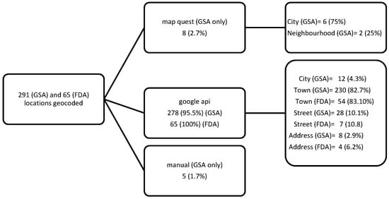 In total, there were 764 instances of manufacturers registering with the GSA. These instances related to 291 locations, of which 278 were geocoded using the Google Maps API and the remainder either via the MapQuest API or manually (Figure 1). All were geocoded to at least the city level and the majority to the town or neighbourhood level, with only eight being geocoded to address level. The FDA records contained 180 manufacturers in 65 locations across the Greater Accra Region. The locations were all geocoded with Google Maps API to town level or higher precision (Figure 1).