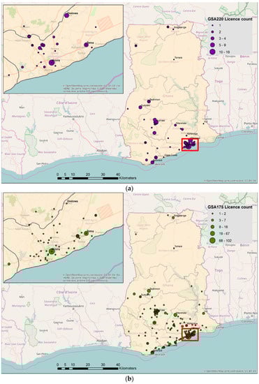 Density of licences granted within the Greater Accra region as of June 2016 by the Food and Drugs Authority for production of (a) natural mineral water under Ghana Standard 220 (GS220) and (b) packaged drinking water under Ghana Standard 175 (GS175).