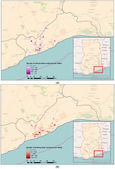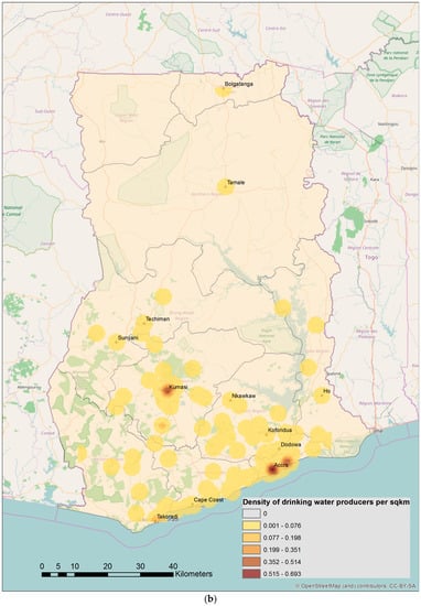 Our findings are affected by several sources of uncertainty. Our analysis is dependent on the completeness and accuracy of the GSA and FDA producer registers. However, smaller-scale, unregistered sachet producers known as “abalowes” are known to operate in Ghana [,] and such unregistered production is not captured in our analysis. Given that unregistered producers typically sell sachets at discounted prices [], such producers are likely to be located close to urban centres of demand, to reduce transport costs. In common with many developing countries, Ghana lacks an address referencing system for precise geocoding []. Furthermore, whilst regulators record manufacturing facility locations as well as registered business addresses, there is potential for the two to be confused. The town-level precision of geocoded producer addresses and coarse spatial resolution of some of the hydrogeological map layers used may thus have affected our assessment of the density of packaged water abstraction. Our examination of the spatial pattern of packaged water production and consumption did not consider the distribution sector of the supply chain. It is thus possible that packaged water is transported long distances to markets, despite the proximity of production facilities to major urban centres. We also assume that packaging and source water extraction take place at the same location.
