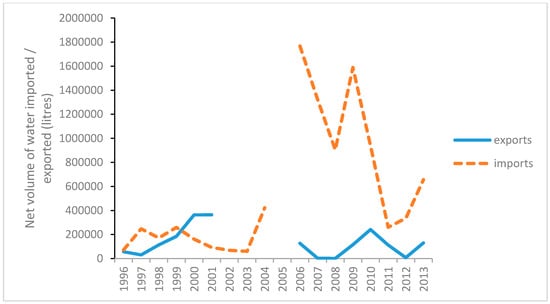 Annual volumes of imported and exported unsweetened beverage waters and ice, 1996–2013, as reported by the Government of Ghana (source: Department of Economic and Social Affairs/United Nations Statistics Division, United Nations Comtrade database).