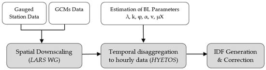 The present paper presents an approach based on spatial downscaling—temporal disaggregation method (DDM)—to develop future IDFs using stochastic weather generator, Long Ashton Research Station Weather Generator (LARS-WG) and the rainfall disaggregation tool, Hyetos. The work was carried out for the case of Bangkok, Thailand. The results obtained show that the DDM approach is capable of producing promising results that can be applied to other catchments. Downscaling with LARS-WG gave reasonable results in estimating extreme climate variable (i.e., rainfall series). The downscaled-disaggregated IDFs showed underestimation in intensities, especially for short durations; hence, it was found necessary to correct the bias in IDFs generation.