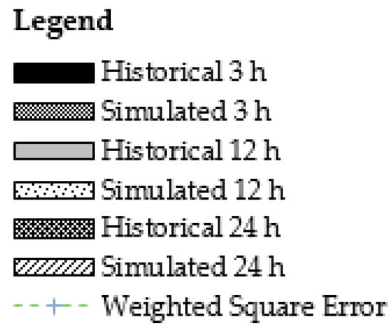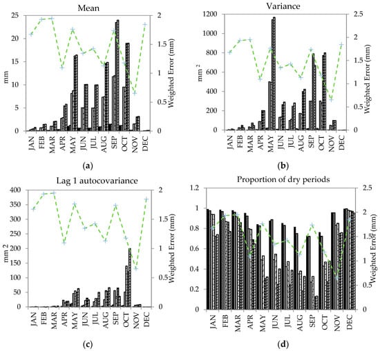Optimization of the variables to minimize weighted error between synthetic and historical observed data is shown in Figure 4. The overall error in simulating disaggregated data is below 2 mm for 3 h, 12 h and 24 h, with satisfactory optimization of mean, variance, lag 1 autocovariance and proportion of dry periods. The optimized parameters for each month (Table 2) were used to disaggregate present observed data and future downscaled daily data. The same parameters have been used for past and future disaggregations.