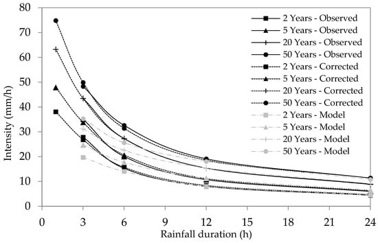 For the comparison of disaggregated rainfall (daily to hourly) with the observed 3 h rainfall, the disaggregated 1 h data were aggregated to 3 h data, from 1981 to 2010, and IDFs were generated. The disaggregated data (i.e., modelled data) showed significant underestimation as compared to the observed data for the duration of 3 h; however, the underestimation was observed to be relatively lower for longer durations (Figure 6). Thus, the correction factors were used to correct the bias for modelled rainfall intensities (Table 4). The differences and ratios between observed and simulated intensities were found to be larger for shorter durations and smaller for durations of longer than 3 h. For all durations, the differences increased with return periods. Nevertheless, the ratio remained almost equal for different return periods for a specific duration of rainfall.