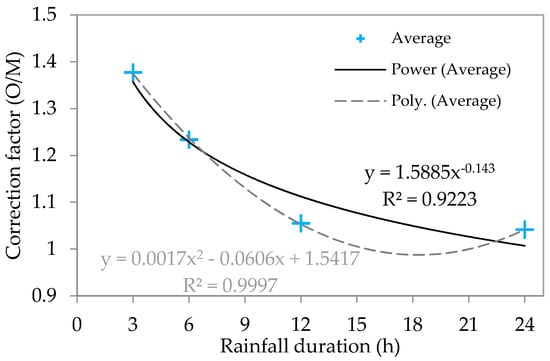 The average ratios of observed to modelled data at different rainfall duration were fitted into a power and polynomial equations and the resulting equations are the function of rainfall duration, which is independent from the return period (Figure 7). Coefficient of Determination (R2) for the fitted polynomial equation showed better accuracy than other equation. Using the equation,