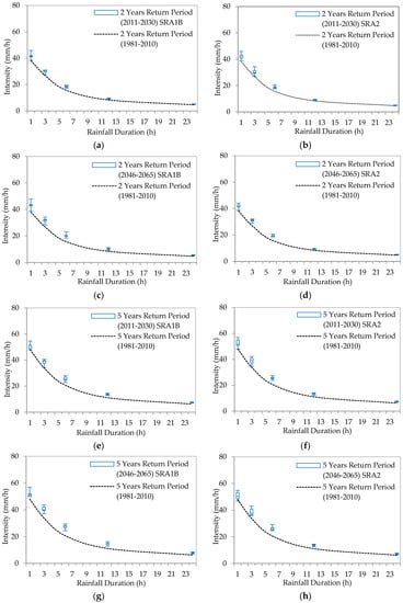 Since the time of concentration for the case study area is approximately 2.5 h, it becomes relevant to compare intensities/accumulated rainfall for 3 h, in the perspective of urban flood and urban drainage management (see [62]). In 2011–2030, the maximum 3 h rainfall increments are projected by HADCM3 and IMCM3 in SRA1B (15.4%) and NCPCM in SRA2 (27.8%) in 2 years return period, HADCM3 and IMCM3 in SRA1B (20.4%) and NCPCM in SRA2 (24.4%) in 5 years return period, HADCM3 and IMCM3 in SRA1B (21.9%) and HADCM3 in SRA2 (30.4%) in 20 years return period. In 2046–2065, the maximum 3 h rainfall intensities increments are projected by HADGEM in SRA1B (27.0%) and MPEH5 in SRA2 (19.1%) in 2 years return period, NCCCSM in SRA1B (28.8%) and GFCM21 in SRA2 (26.7%) in 5 years return period, IPCM4 in SRA1B (41.2%) and HADCM3 in SRA2 (30.4%) in 20 years return period (Table 5).