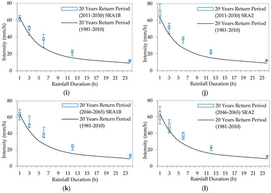Results in box and whiskers plot from nine GCMs’ derived IDF curves for 2-, 5- and 20-years return periods: for the SRA1B scenario (a,c,e,g,i,k); and for the SRA2 scenario (b,d,f,h,j,l) for future periods (2011–2030, and 2046–2065) compared with present IDFs (1981–2010).
