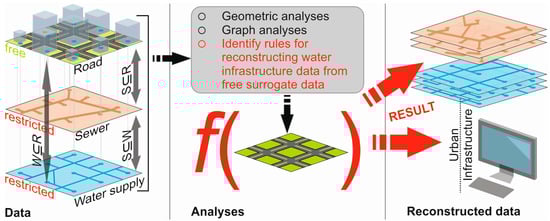 One of the key issues of urban water infrastructure is that the pipes and sewers are underground structures with direct and obvious spatial information on the location only given at the manholes. The sheer size of the network (the typical dimension of the specific pipe length per person is 10 m) often results in unclear, wrong, and occasionally missing data. Hence, the required data for network analysis (likewise, statistical- and model-based) is often not completely available, not freely accessible (due to security concerns), or of poor quality (e.g., wrong data records of infrastructure element properties). Therefore, a substantial amount of time is spent in data collection and observation. However, even if data is available, it is frequently not stored in a digitized format needed for further processing (e.g., ESRI Shapefile). High-resolution spatial infrastructure data (e.g., consumption data at the household level) belong to different authorities, complicating the exchange and arbitrarily intersecting the data in terms of legal aspects even more (e.g., the exchange of data with third parties is often forbidden and subject to legal terms and conditions of operating companies). Thus, even though datasets exist, legal aspects may counteract a successful data exchange. Considering that the evolvement of water infrastructure networks began several decades ago [9], the availability of historical data is even worse. In this case, information on the build year of network components is indispensable. Finding alternative approaches to generate and extract missing data out of alternative data sources (surrogate data) on infrastructure networks is, therefore, a relevant research topic—notably for the purpose of model-building, especially for research purpose.