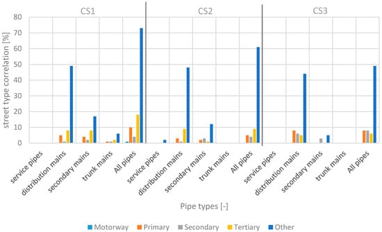 Figure 5 shows selected general geometric results from all three case studies. Compared to the geometric analysis performed in Mair et al. [12], in which a pipe or conduit is identified to be below a street independently of the length, in this work, the results depend on the pipe or conduit length. The average values show that approximately 50% of the street network contains 78% of the water supply or sewer network. Due to the limited area for water supply and sewer systems in high-density areas, this value is increasing, demonstrated by CS1 with a value exceeding 90%.