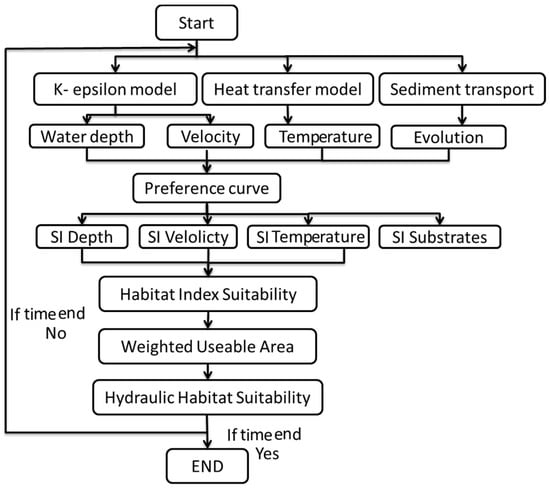 Literature in habitat model provides various methods to describe fish habitat in the river, and this gives a detailed description of the flow velocity calculation, fish type study, modeling parameters determination and aquatic habitat equation estimation [13,15]. Physical habitat models have been used as a tool for river management since the 1980s. For example, the physical habitat simulation (PHABSIM) model which was the first fish habitat model [16,17], did not consider the hydrodynamics. Later, another fish habitat evaluation tool named River2D was developed, which did not consider water temperature [18,19,20]. Since the 2000s, there is an increasing realization of the role played by flow scour and flow temperature in characterizing the habitat quality in rivers [14]. While considering hydraulic indices, it is important to couple both sediment transport and heat transfer equations with a habitat model so as to obtain a more precise and reliable model to predict river and fish habitat.