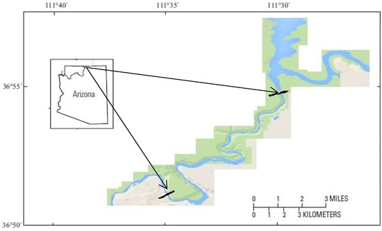 The site of spawning and juvenile rainbow trout living in Colorado River—stretching from downstream of the Glen Canyon Dam to Lees Ferry—was analyzed to verify the high flow effects on flow velocity, water depth, temperature and substrates on the tail water of the dam and the habitat suitability quality. The river stretch is shown in Figure 4. A mesh of 300 × 20 was used in the model system with geographic data being interpolated from a surveyed cross-section (2,550,000 m2).