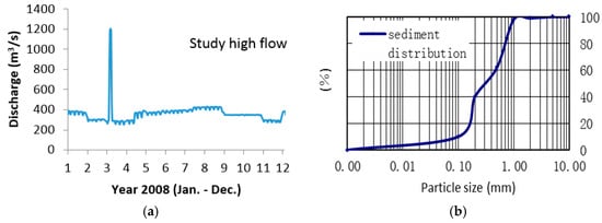 Daily mean discharge released from the Glen Canyon Dam during high flow effects in 2008 (a) and sediment distribution in the river bed during high flow effects in 2008 (b).