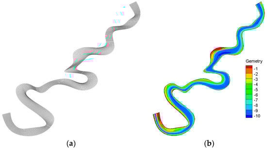 Study area mesh (a) and the bathymetry data of the river stretch (b).