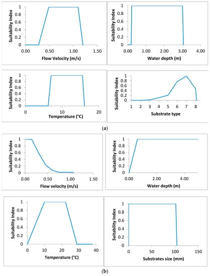 The habitat model is constructed based on the hydraulic variables from the CFD simulation and fish preference curves. Fish preference curves are, in turn, founded on literature, laboratory studies and frequency of the field observation (which has certain values within a variable range of values for fish habitat). The preference curves applied in this study are mainly taken from a specific fish study on the Colorado River and only four indices which significantly affected fish habitat were chosen [36,37,38]. These fish preference curves are specific for spawning and juvenile rainbow trout. The habitat suitability index value ranges from 1 to 0, with 1 for the highest value and 0 for the lowest value. The preference curves for study species are show in Figure 5. The habitat model is related to physical and ecological parameters for evaluating the natural and unpolluted rivers.