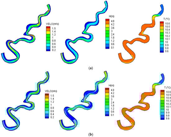 Simulation output of the velocity, water depth and temperature distribution before the high flow effect (HFE) (a) and after the HFE (b). (VELO = velocity; H = water depth; T. = temperature; HFE = high flow effect).
