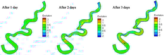 Simulation results have been portrayed for the river bed elevation in Figure 7. It can be understood easily that after 1 day, the river bed elevation was minimal, covering almost the whole reach with positive elevation values ranging from 0.1 m to 0.25 m in the middle portions of the river. At the inlet which is also the narrowest part of the computational domain, some negative values of bed elevation were also observed with values around −1.3 m. Thereafter, positive bed elevation increased in terms of both values and area. The negative bed elevation affected areas also increased in size at the inlet and in several small patches of the computational domain with minimum values being around −1.8 m. At the end of the HFE, it can be noted that the positive bed elevation was mainly emphasized on the middle and downstream of the computation domain with a maximum value of 2 m. In contrast, negative bed elevation spread in the upstream area and near to inlet areas with a minimum value of −2.1 m.