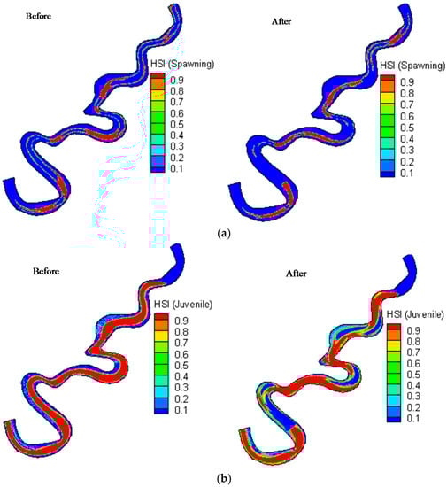 Before the HFE and after the HFE habitat suitability index distribution for spawning (a) and juvenile (b) rainbow trout.