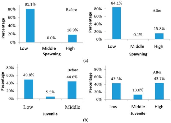 Before the HFE and after the HFE high, middle and low habitat suitability index distribution for spawning (a) and juvenile (b) rainbow trout.