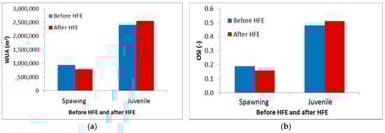 Before the HFE and after the HFE weighted usable areas (WUA) and overall suitability index (OSI) for spawning rainbow trout (a) and juvenile rainbow trout (b).