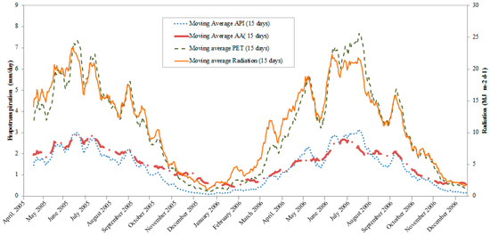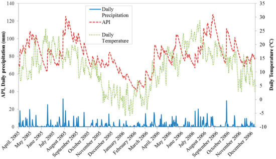 30]. The API represents the antecedent moisture content prior to a rainfall event, computed as a weighted summation of daily precipitation depths as follows