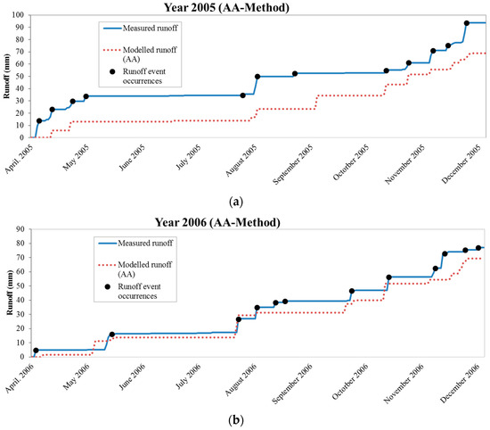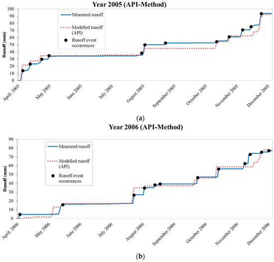 In particular, according to the API model, runoff overestimation (max 36% on 20 April 2005) generally occurs during the warmer period of the simulation, i.e., the spring and summer seasons, whereas underestimation (max 24% on 24 November 2006) generally occurs in late summer and autumn seasons. In the case of the AA model, the hydrological scheme tends to consistently underestimate runoff during the total period, with errors ranging from 9% to 300%.