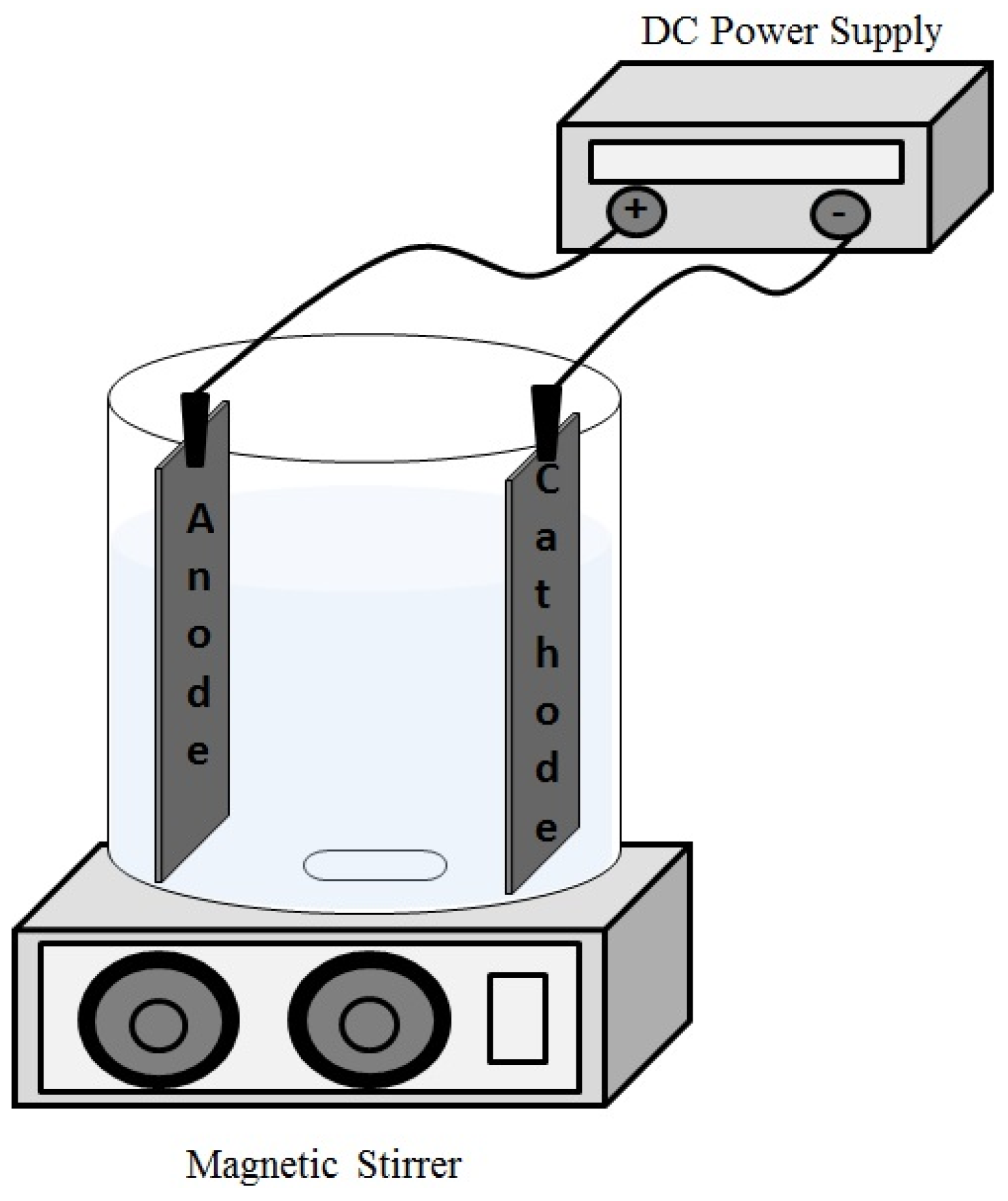The experimental setup is shown in Figure 1. Batch experiments were carried out in a 1.8 L electrochemical reactor with aluminium (5 cm × 16.5 cm × 0.2 cm) and stainless steel (6 cm × 16.5 cm × 0.2 cm) plates as the anode and cathode, respectively. The electrode distance was maintained at 5 cm during electrolysis. A direct current was supplied by a DC regulated power source (TTi CPX400S 420W DC Power Supply) at an intermittent application of 5 min ON/20 min OFF. A mixing speed of 300 rpm was performed using a magnetic stirrer to ensure good mixing in the reactor, minimize regional differences and break up flocs. It is comparable to the different stirring speed used in other studies [38,39,40]. Sodium hypochlorite was used to clean the electrodes before starting the experiment.