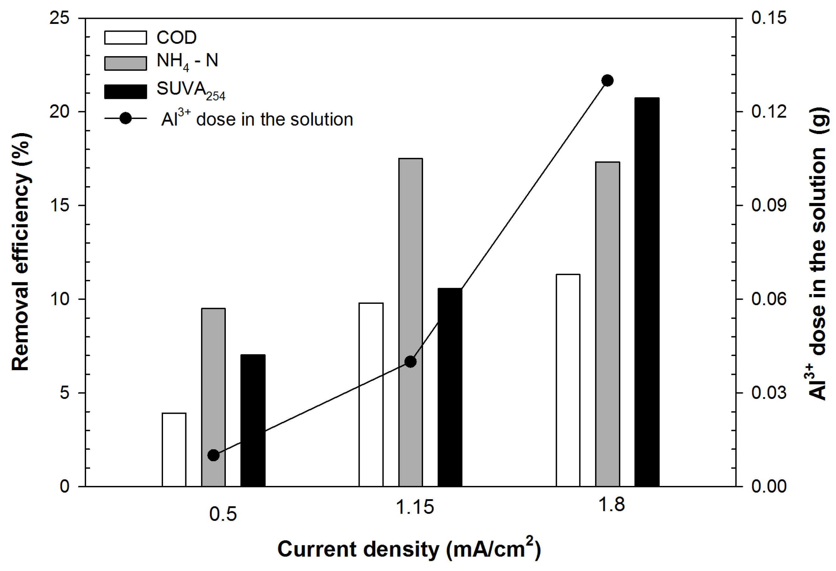 Removal efficiencies of COD, NH4-N and SUVA254 at varying current densities (conditions: initial concentration = 4 mg/L, HRT = 19 h) and concentration of Al3+ dissolved in the solution at increasing current density.