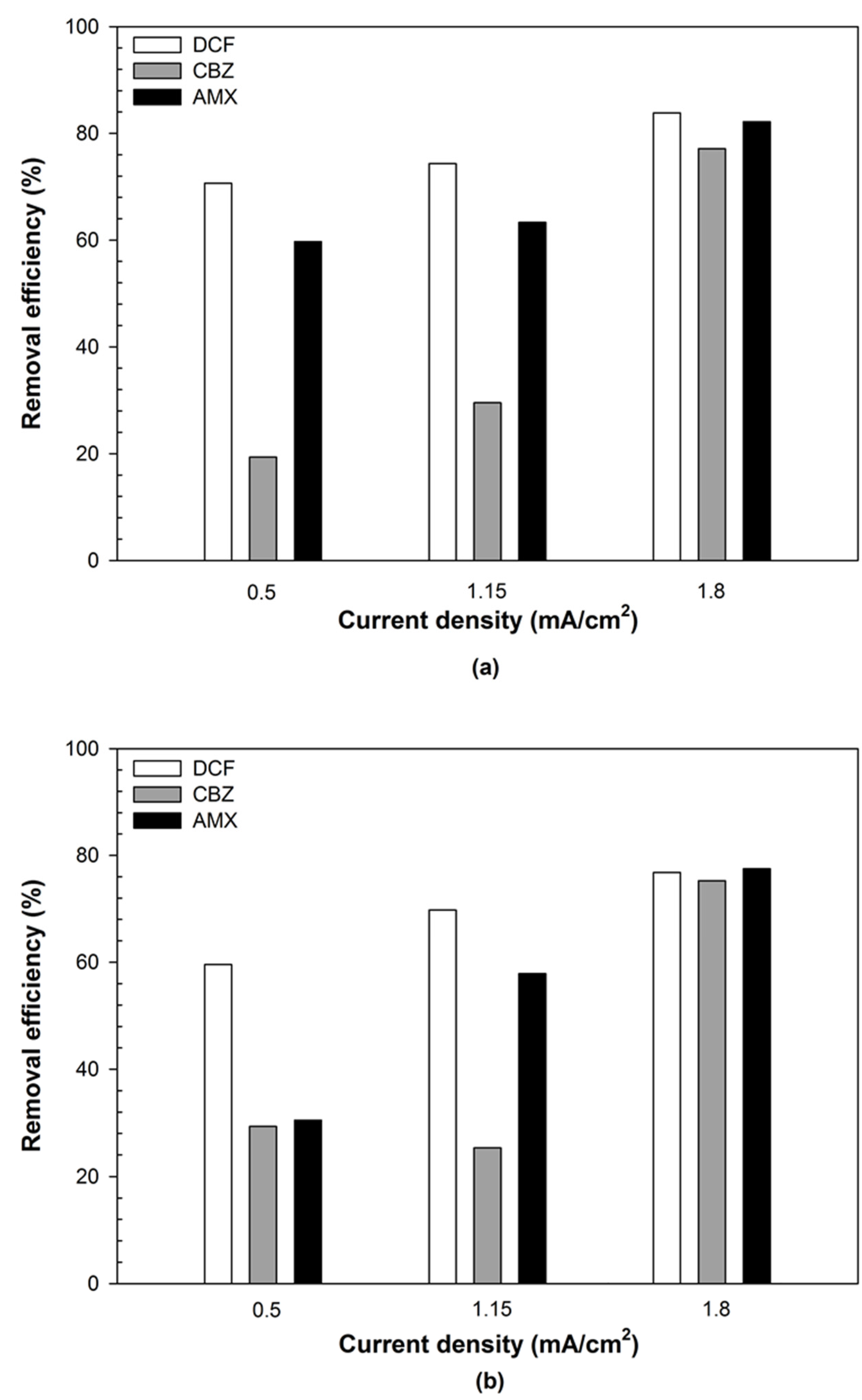 Effects of current density on the removal of pharmaceuticals by electrochemical processes: (a) Individual pharmaceuticals; (b) Mixture of pharmaceuticals (conditions: initial concentration = 4 mg/L, HRT = 19 h).
