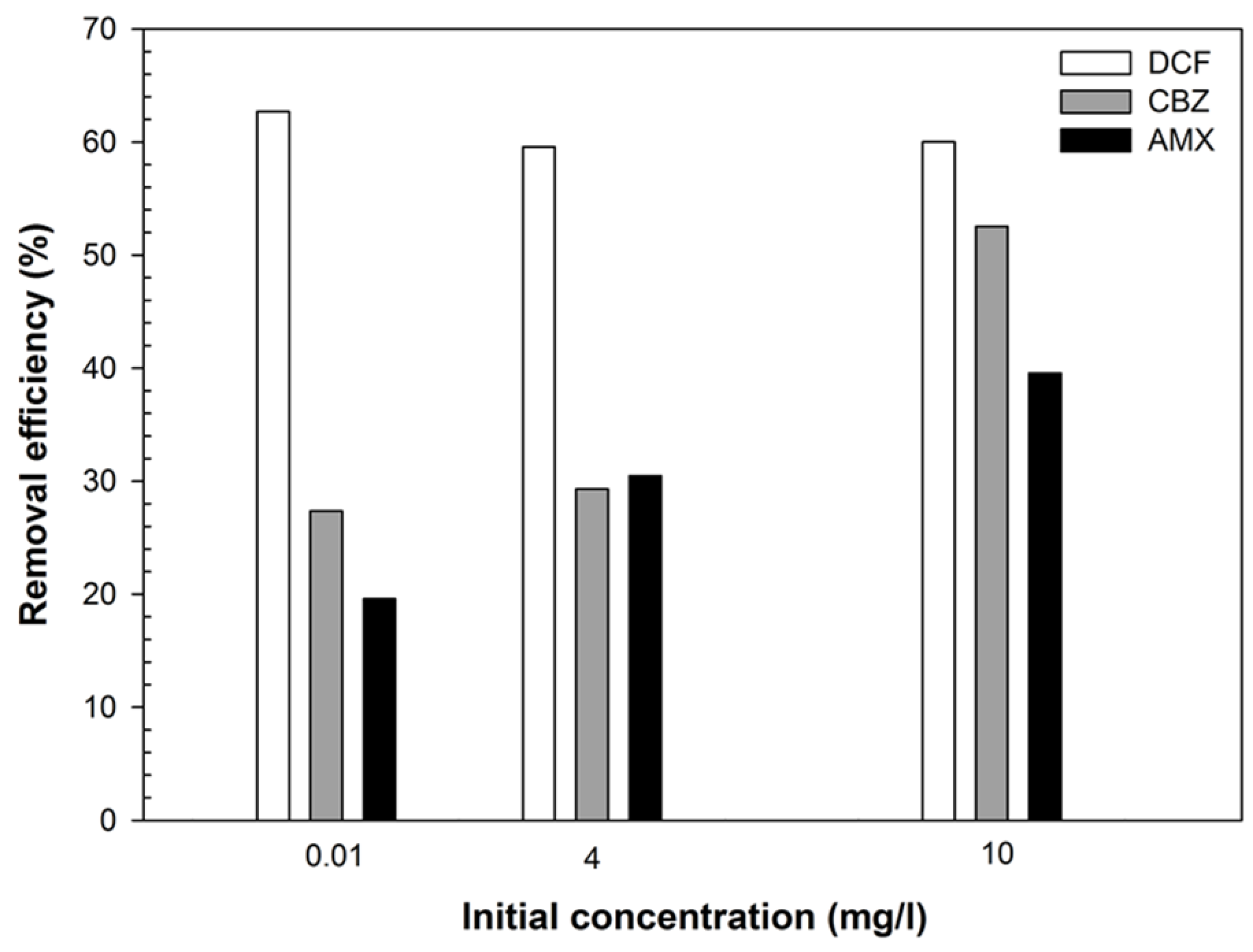 The effects of varying initial concentration (0.01, 4 and 10 mg/L) on pharmaceutical removal were investigated using a mixture component system at a current density of 0.5 mA/cm2 and HRT of 19 h (Table 2, Run 14, 17 and 20). For CBZ and AMX, degradation efficiencies increase at an increasing initial concentration (Figure 4). This can be attributed to the increase of concentration gradient which means a stronger driving force to overcome all mass transfer resistances of solutes between the aqueous and the solid phase [67,68]. As a result, there is better adsorption to electrocoagulants. The initial concentration has little or no effect on DCF removal which ranged from 59.57% to 62.73%. Among the three compounds, DCF is the most soluble (Table 1), hence, as DCF is adsorbed on the aluminum hydroxide precipitates, it becomes more stable in the solution. As a result, it became more difficult to remove the pharmaceutical, possibly due to an increase in the interaction between the DCF and the adsorbent.
