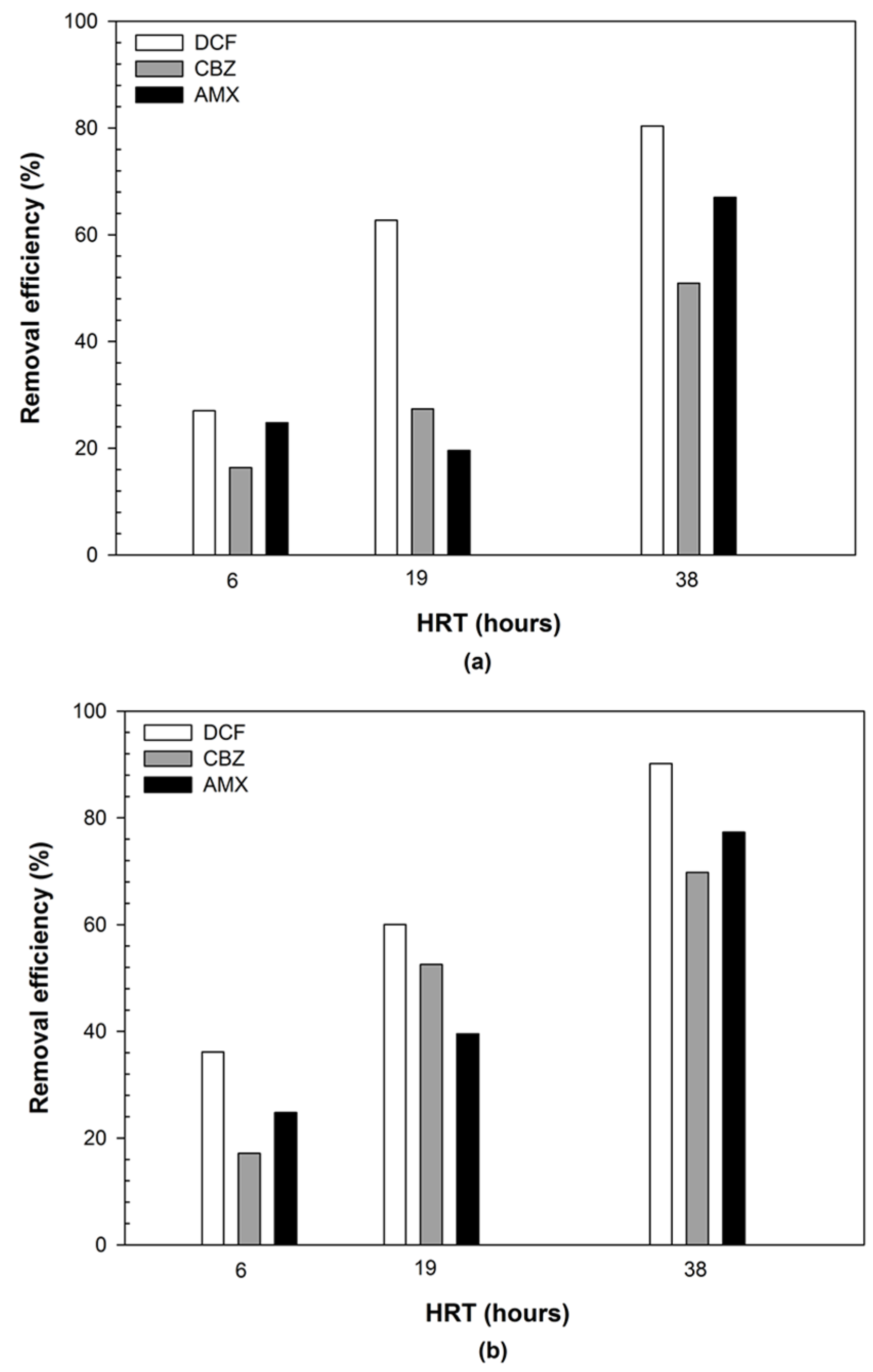 Effects of HRT on the removal of pharmaceuticals by the electrochemical process at an initial concentration of 0.01 mg/L (a) and 10 mg/L (b) (j = 0.5 mA/cm2).
