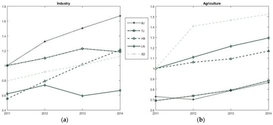 However, in terms of agricultural water use efficiency, BJ and TJ have the worst performance; SD’s is the best, followed by the other two provinces. Agricultural water use efficiency improvement could be directly connected to industrial structure. Agricultural water use in BJ and TJ accounts for just a small portion in the industrial structure. Comparatively, HB and SD lack water, but their agriculture require a large percentage of production, so it is necessary for them to improve agricultural water use efficiency.