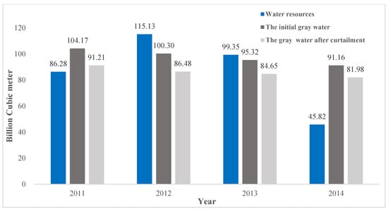 A comparison of water resources amount, the initial gray water footprint, and gray water footprint after curtailment of Bohai Economic Zone from 2011 to 2014.