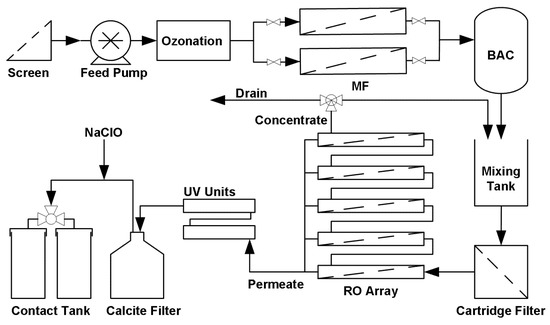 - Ozonation, employing a strong oxidation effect of ozone on pathogen inactivation, bio-degradability improvement of organic matter, degradation of chemicals of concern (CoC), a lower chemical consumption associated with cleaning of the downstream ceramic micro-filtration (MF) and improved backwash efficiency [4,5].