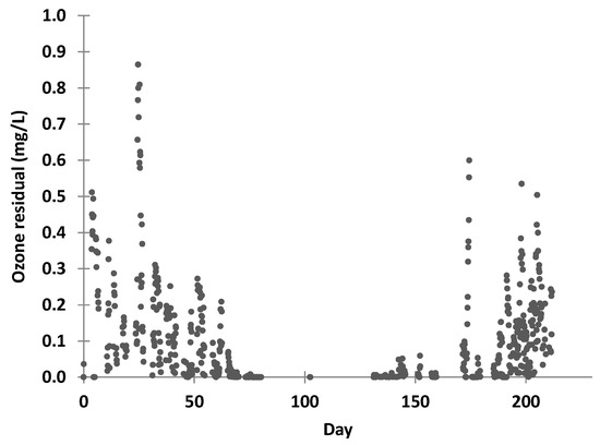 The ozone residual at the outlet of the ozone contact tank is shown in Figure 3, with about 50% of the measured ozone residual value less than the critical value (0.01 mg/L) and 37% greater than the targeted value (0.1 mg/L). It was found that the depletion of the ozone was directly related to the turbidity rather than the ammonia concentration [11].