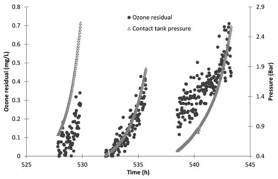 Figure 4 shows the variation of ozone residual along with the varying pressure of the ozone contact tank. The pressure in the ozone contactor varied as a result of downstream fouling of the ceramic MF membrane resulting in a higher upstream pressure and increasing the dissolved ozone concentration in the water. This suggests that controlling the pressure of the ozone system by either placing a control valve on ceramic MF outlet or by including a pressure control valve on the ozone outlet and using a separate ceramic MF feed pump would provide greater control of ozone residuals for high turbidity waters. However, the short trial timespan prevented the installation of such control and inclusion of a MBR upstream of the ozone unit at Davis Station will eliminate high turbidity feed to the ozone system and hence the need for such control.
