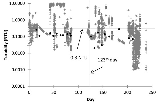 The filtrate turbidity from the ceramic MF measured by the online turbidity meter and the handheld meter are shown in Figure 5. The turbidity readings of the handheld meter all met the target value. However, the reading of the online turbidity meter was occasionally unable to meet the target value, and would trigger an alarm if used as a critical control point. The sample point was moved to the BAC weir from the 123th day to avoid possible influence from air bubbles in the filtrate. The initial on-line turbidity readings remained high, but after 10 min filtration, the turbidity readings were less than 0.2 NTU and mostly less than 0.1 NTU demonstrating the high quality filtration performance of the ceramic MF membranes.