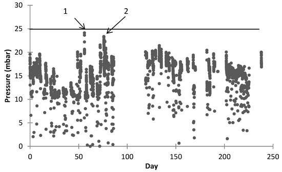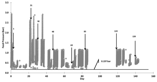 The pressure of the cartridge filter immediately upstream of the RO was also monitored, since the blockage of the filter would lower the suction head, causing the RO high pressure pump to shut down if the pressure was less than −80 kPa. Figure 11 shows three recorded pressure drops of the cartridge filter. Based on the fitting equations in Figure 11, the cartridge filter was able to be used for 7.5 days.
