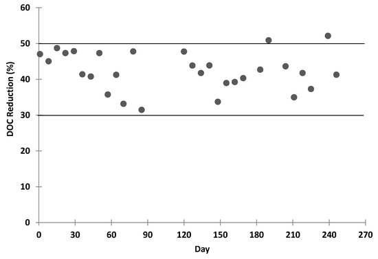 Both adsorption of organic matter and biological activity can remove organic carbon from solution as it travels through the BAC. In Figure 8, the DOC reduction over time is shown. DOC was consistently reduced by 30%–50% in the effluent in comparison with the influent.